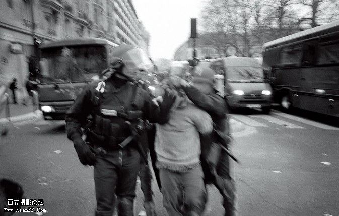 3月18日,索帮大学门口发生严重冲突,由于之前索帮大 学的学生闹事,警察关闭了学校,并沿学校四周封锁了这个具 有巴黎文化象征意义的大学,而攻占索帮已经成为年轻人最主 要的目标。那天晚上的冲突从正门开始,闹事者试图冲过警戒 线。随着冲突的升温,警察动用了催泪瓦斯和水枪,外围警察 的包围圈也越缩越小,最后开始实施抓捕行动。在我冲上前去 试图抓拍一队警察抓人的时候,靠他们太近了,甚至都可以看 到警察头盔玻璃后面紧张的神情。突然窜出一小队长模样的警 察一把抓住了我,问我是不是记者,我本能地回答“不是”,当 我正想解释我是摄影专业学生时,他已经不容我说下去,立马 吩咐身边两名“捕快”把我揪进了警察队伍后面的押解车上。