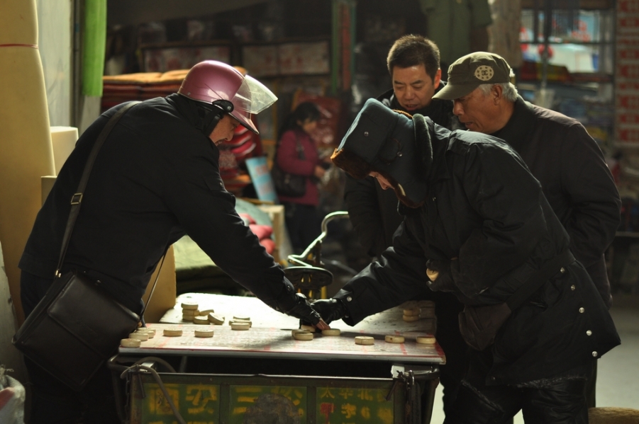 三轮车当桌,一块板是棋盘。 左为戴盔的持绿,右为戴帽的持红,两双大棉手你来我往,持绿者淡定自若胸有成竹,把吃来的棋子规矩的落在盘上。持红者把棋子捧在手里恨不得把对方的棋子都拿光,虽然有旁观者的多次支招,仍逃脱不了失败的命运。为了弄清楚自己为什么败了,众人齐上阵你一言我一语,都是高人。