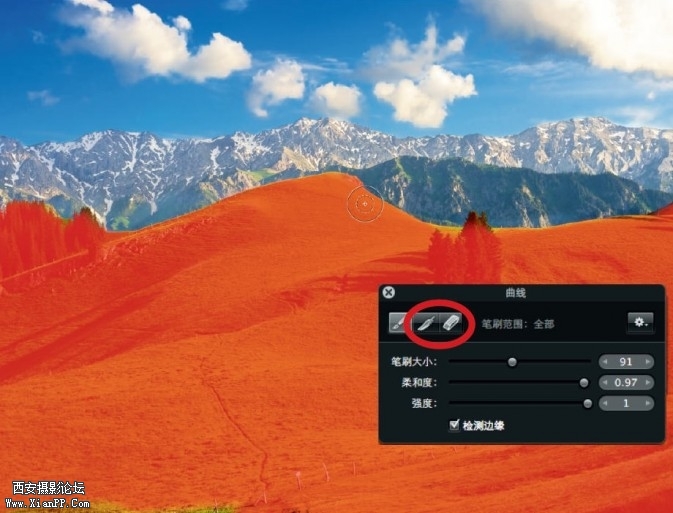 “色阶”浮动调板中的“检测边缘”的使用是有窍门的:在涂白墙部分时,不勾选。涂绘屋顶和天空交界处时,再勾选它。