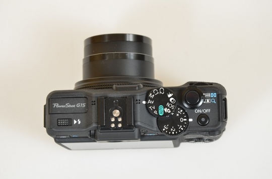 顶部的东西比较丰富,有可弹出的闪光灯,佳能标准热靴接口,双模式转盘,快门按键和开关键。