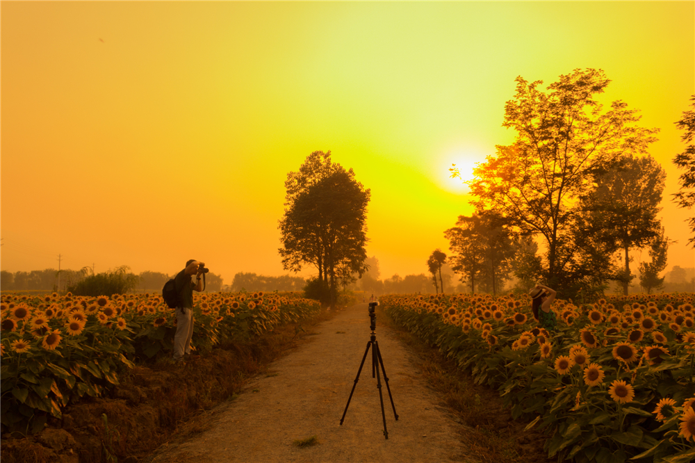 楼观台葵花 夕阳下的摄影者和模特