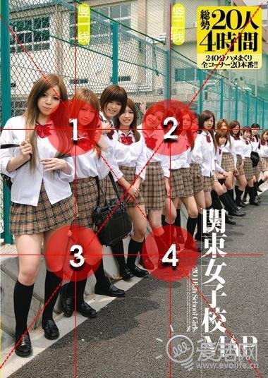 在AV封面中,三分法也用得尤其多。例如题图,主体人物在右侧三分线上,而胸部和膝盖都大致在三分点上。这样就能表现女优良好的身体比例,并凸显其“重要部位”。这样的例子还有很多……
