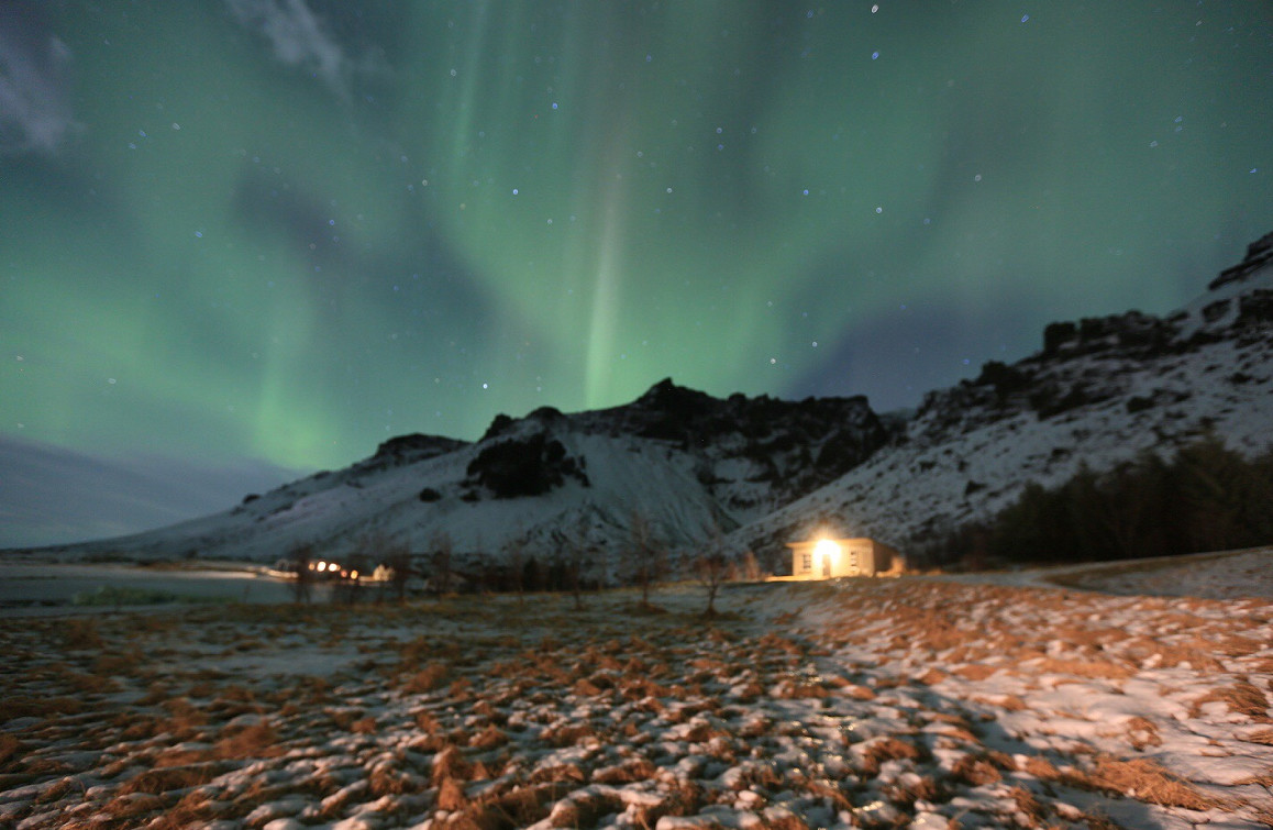 冬天的冰岛会有几个月日照不足几个小时的极夜。银装素裹,冰封万里,夜空中极光变化,出五彩的锦带。