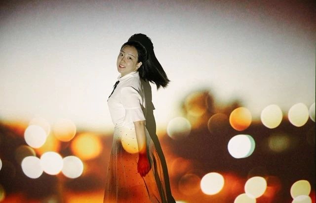 还有一个需要注意的问题就是模特的影子。影子是由投影高度和模特与背景墙的距离决定的。因此,你需要保证投影仪架设在模特正前方,而让模特尽量靠近背景墙壁站立,这样会有效控制影子的范围;同时,少量影子也可以让人物更具立体感。投影人像属于弱光环境人像,需要用大光圈,高感光度拍摄,以保证正常曝光。上图就使用了 f/2.8 的大光圈和 1600 的高感光度。如果你想要为作品增添一些动态感,还需要近一步提高感光度。以下图为例,背景图片是街边点点的光斑,在拍摄中我们想制造出“偶然回眸间”的感觉,就需要提高快门速度,所以需要更高的感光度。