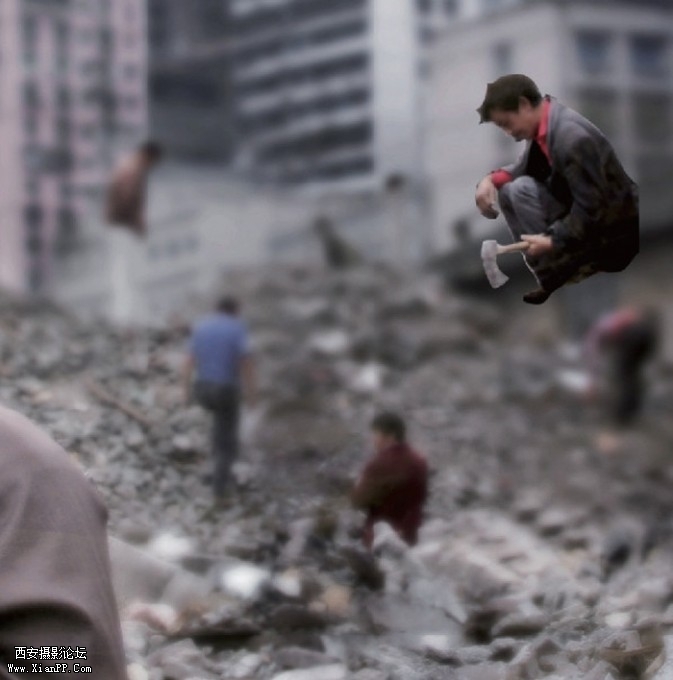 首先,让我们先分析一下这幅作品,作品的整个背景是拆掉的房屋瓦砾碎片,远处细细碎碎的几个人对影像画面不构成威胁,那么唯独剩下近景处这位蹲着的哥们儿,他将画面的视线范围变宽,让画面的主体变成了两个,所以我们第一个想到的就让他从画面中彻底消失掉,这就会用到我们的第一个方法,此方法能够让你几乎没有破绽地在画面上移除一个物体;如果你觉得这个人物仍然需要放在画面中,只是需要移动一些位置,或者改变一下大小,那么我们可以使用到第二个方法将这个人物移动到更适合他的位置上,真正地做到一个不多,一个不少。