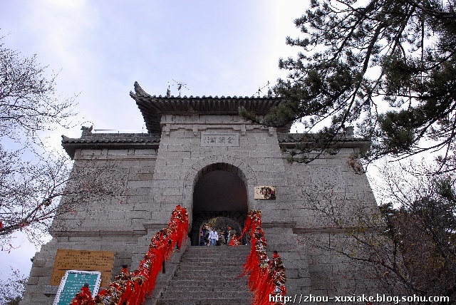 金锁关是建在三峰口的一座城楼般石拱门,是通往东西南峰的咽喉要道,俗语说“过了金锁关,另是一重天的”。