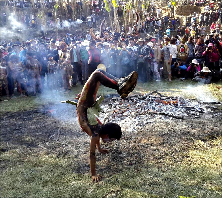 云南弥勒彝族阿细人一年一度的“祭火节”,又名“赤裸狂欢节”。非常传统的民族节日,充满了原始、新奇而神秘的色彩,青壮男赤裸用五色土的颜色纹身纹面,成群的少数民族群众齐聚载歌载舞,摔跤等各种独具民族特色的表演。文身遮面的男人,鱼贯跳过火堆、跨过火阵,将手中的木叉、枪棒投入火中,意味着除尽所有的灾害、污秽和邪魔。